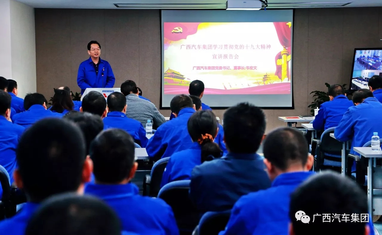 為深入學習貫徹黨的十九大精神,?12月6日,廣西汽車集團舉行學習貫徹黨的十九大精神宣講報告會,廣西汽車集團黨委書記、董事長韋宏文在會上作題為《新時代·新氣象·新作為》宣講報告。集團公司黨委領(lǐng)導、各級黨組織書記、一級經(jīng)理、所屬企業(yè)負責人等一百多人現(xiàn)場聆聽了報告,山東、重慶、桂客等單位以視頻形式參加報告會。