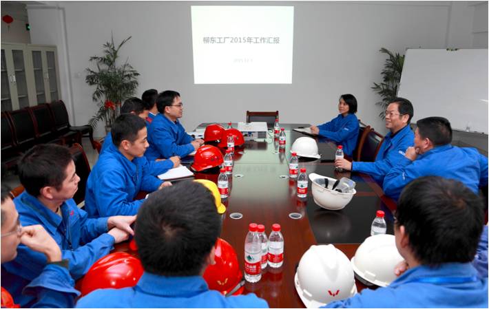 ? ??隨后,韋董一行來到公司柳東工廠進(jìn)行調(diào)研,在參觀生產(chǎn)現(xiàn)場后與柳東管理團(tuán)隊進(jìn)行座談。柳東工廠廠長黃輯匯報了2015年柳東工廠運行情況及2016年業(yè)務(wù)突破。